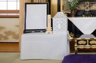 ご遺骨・法名(白木の仮位牌)・遺影のみ安置し、蝋燭立・花瓶・香炉は仏壇にお飾りします。